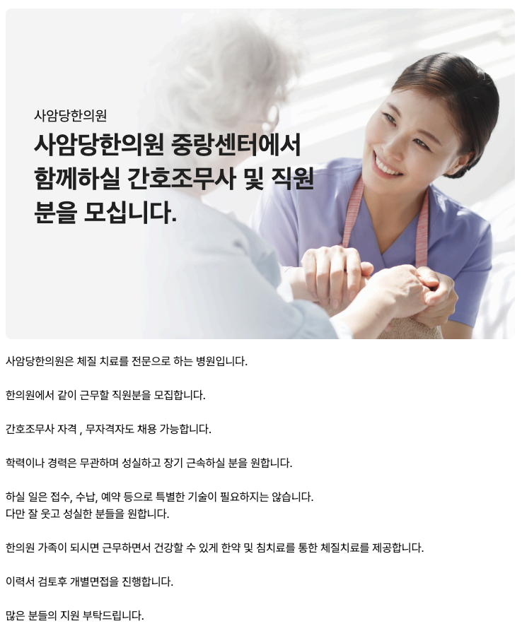 (마감) 사암당한의원 중랑분점에서 함께하실 간호조무사 및 직원분을 모십니다.