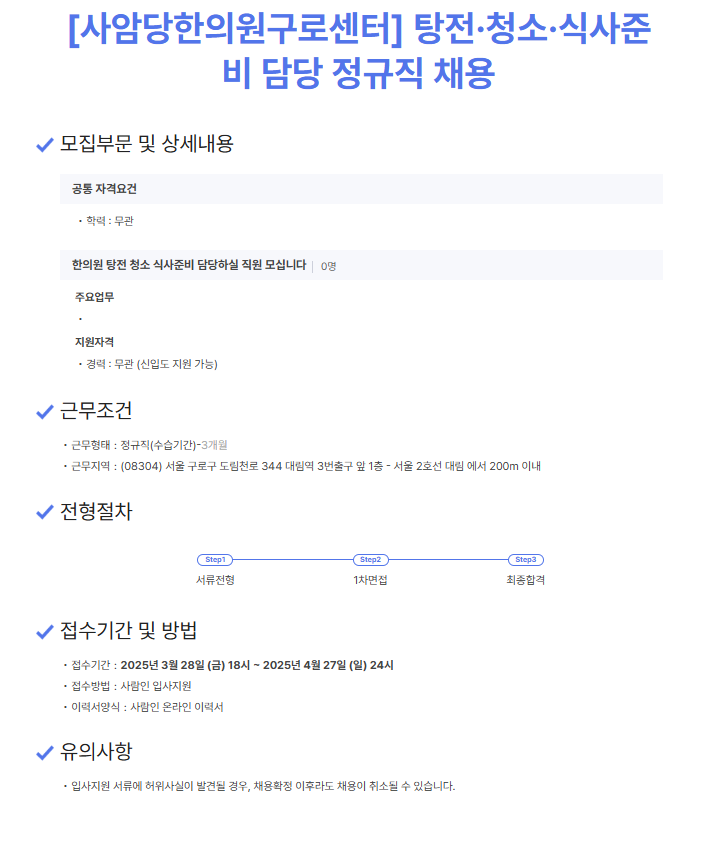 사암당한의원 구로점에서 탕전·청소·식사준비 담당 정규직 직원분을 모십니다.